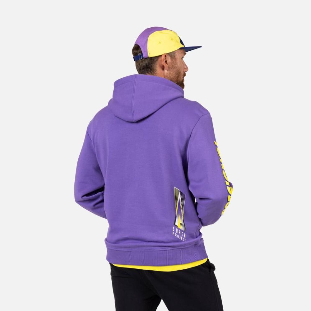 Rossignol SUPER HOODIE-SUPER VIOLET-mikina Retro revival. Mikina Super Hoodie oslavuje historii horských sportů Rossignolu odkazem na kultovní lyže 7S z roku 1992. Design je zvýrazněn výraznými barvami a výraznou grafikou, která byla na lyžích