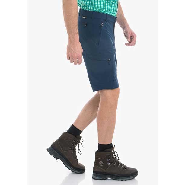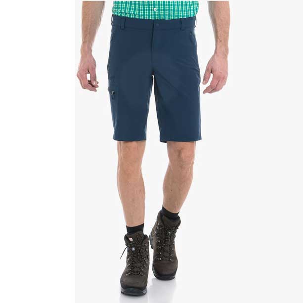 Schöffel Shorts Folkstone pánské modré turistické kraťasy. Lehké šortky vyrobené ze 4směrně strečové látky s možností nastavení pasu na vnitřní straně a kapsami na zip.
