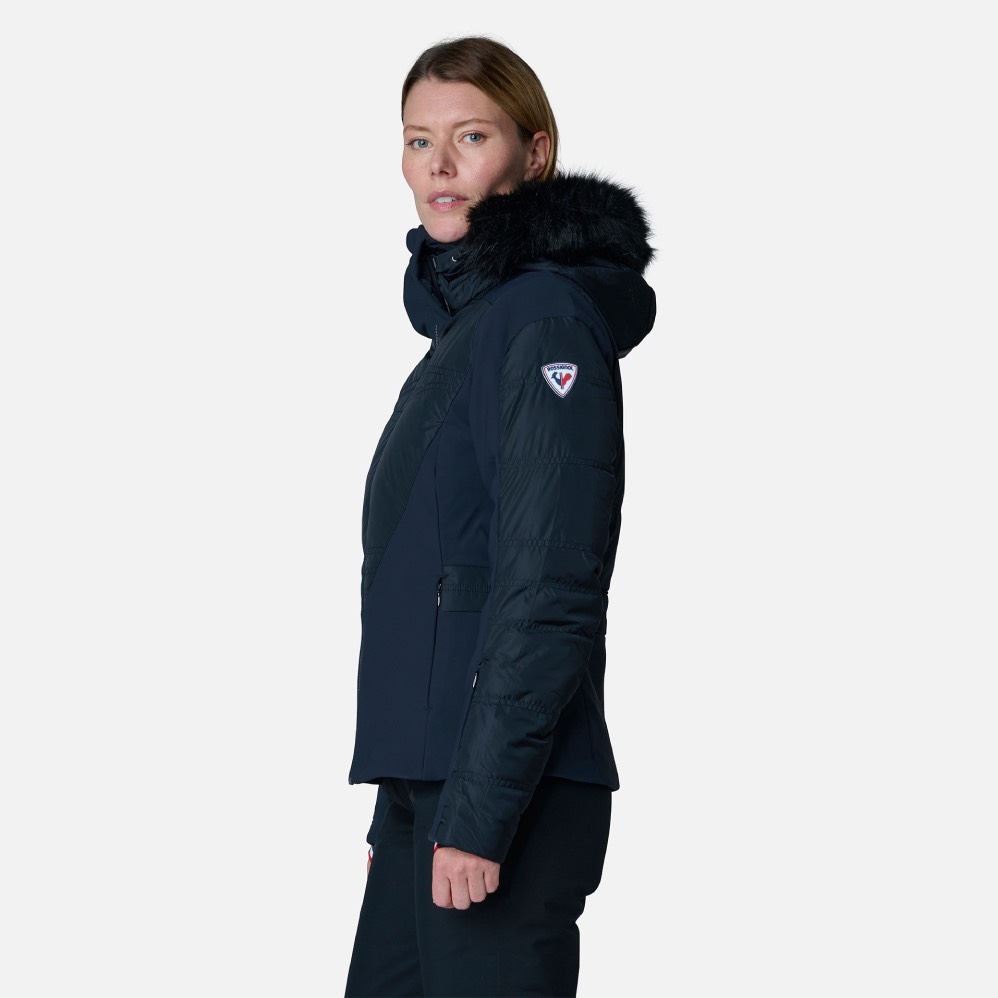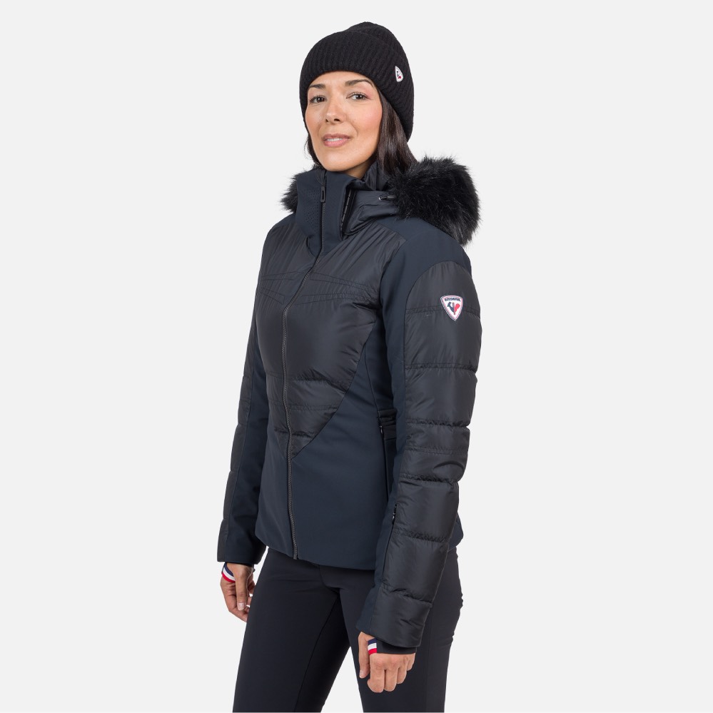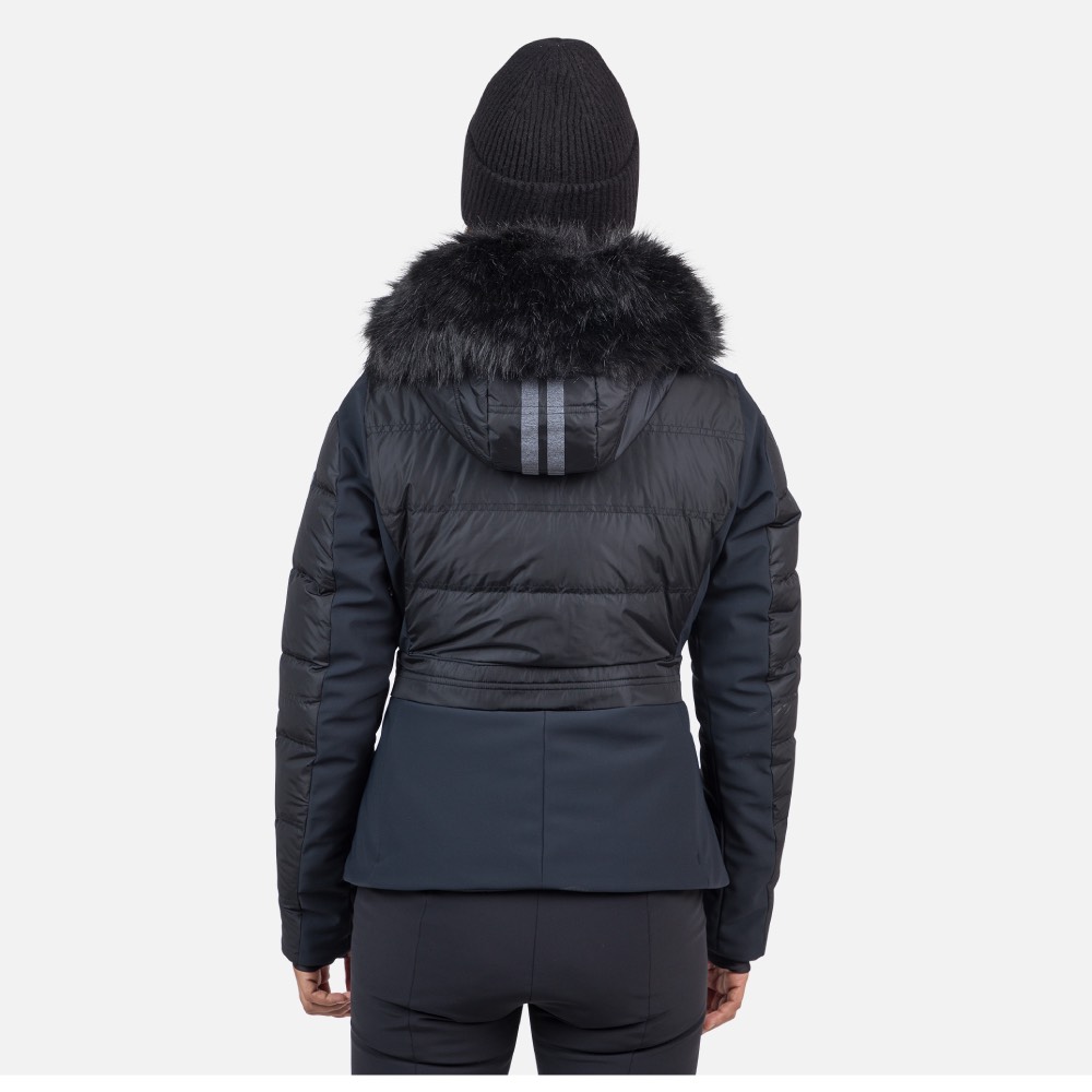 Dámská lyžařská bunda Rossignol Victoire Hybrid s odnímatelnou umělou kožešinou na kapuci. Voděodolná, prodyšná, vyplněná prémiovým peřím, elegantní mix matné a lesklé látky. Vyrobeno z recyklované izolace, GRS certifikované."